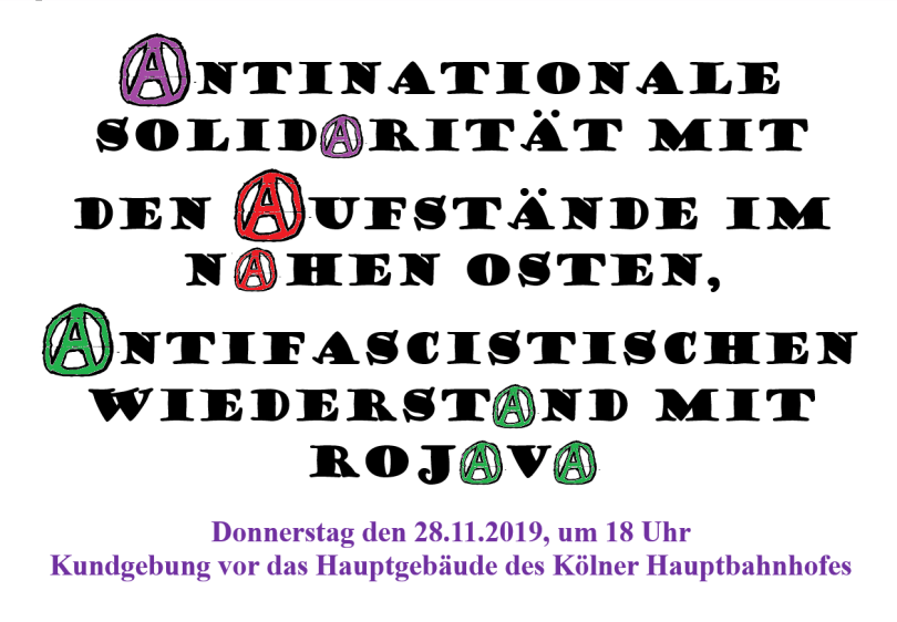 27 تشرینی دووهەم 2019 1258 × 873 Aufruf: Antinationale Solidarität mit den Aufständen in den Ländern des Nahen Ostens und dem Widerstand in Rojava _ Kundgebung in Köln am 28.11 um 18 Uhr