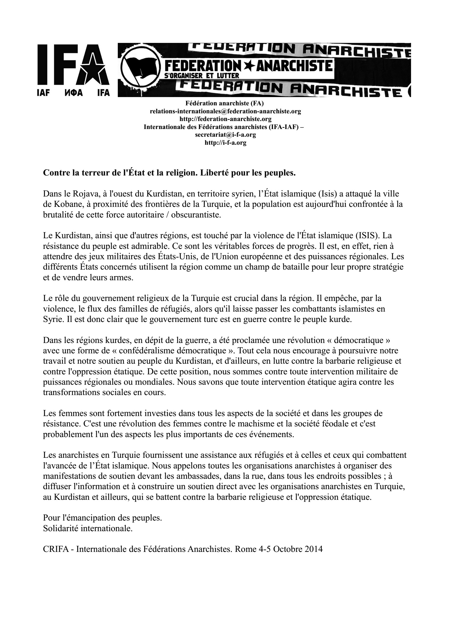 Nous sommes en relations avec le KAF (Kurdistan Anarchist Forum) et ils étaient présents au dernier Salon du livre anarchiste de Paris.